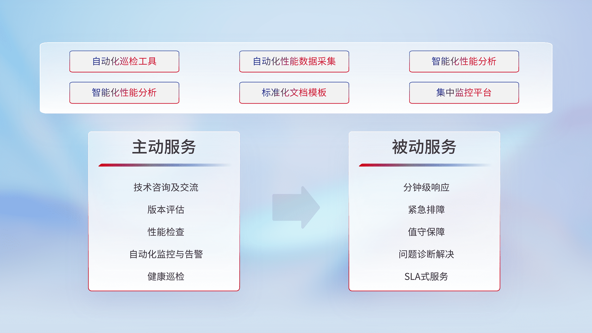 智能化工具和标准化文档,,保障服务质量,,,,提供主动服务(包含技术咨询、、、、版本评估、、、、性能检查、、、自动化监控与告警、、、健康巡检)和被动服务包含(分钟级响应、、紧急排障、、、、值守保障、、、问题诊断解决、、SLA服务)。。